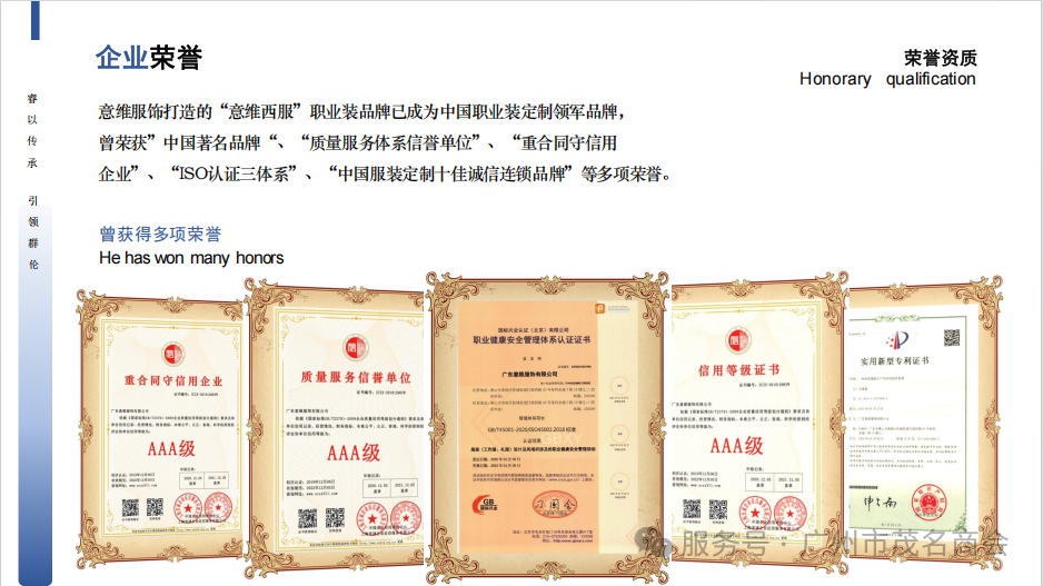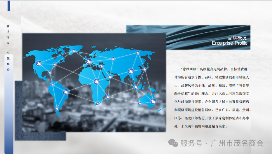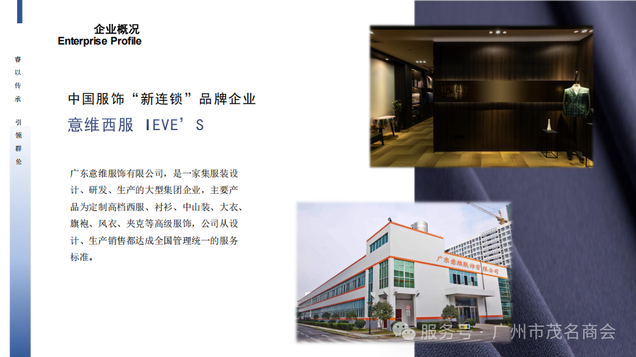 “意维西服”高级量身定制品牌,目标消费群体为所有追求个性、品味、精致生活的都市精锐人士,品牌风格为个性、品味、精致。贯彻“将奢华融于优雅”的设计理念,并注入意大利顶尖服饰文化与时尚流行元素,在全国各大城市的五星级酒店和顶级商场建设销售网络,已在广东、福建、贵州、江苏、黑龙江等省份开设了多家定制体验店和办事处,未来两年销售网络逾超百余家。