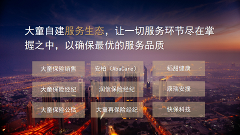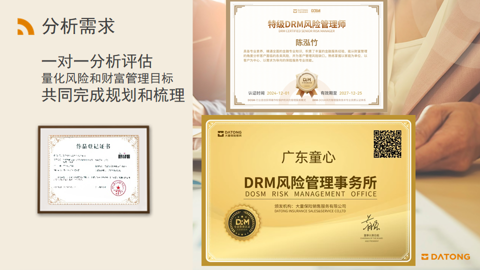大童正推动其专业顾问从“保险代理人”向 “风险管理师” 转型,提供知识服务和综合风险管理解决方案。其DRM风险管理师团队经大童DOSM体系培训及实操认证,以“医生式咨询”为客户做风险扫描、与140+保险公司合作,优选适配产品,为客户提定制化的风险减量方案,及围绕美好生活的全生命周期的配套服务。